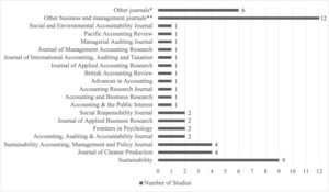 Figure 3 presents a bar chart categorising the 54 studies by the journal where they were published. It reveals diverse publications, with Sustainability; Journal of Cleaner Production; and Sustainability Accounting, Management and Policy Journal representing the most popular journals (hosting nine, four, and four studies respectively). This suggests that these journals are key venues for disseminating research on CSR reporting in China. The distribution of studies across journals highlights some concentration of research in a few key journals while indicating a broad scope, with many journals contributing only one or two studies. The presence of numerous journals with a low number of studies might indicate research gaps or areas that have not yet gained significant attention. Furthermore, while Figure 3 indicates a core group of accounting journals, there are studies published in other business and management journals and journals in other research areas. This result indicates a need for more outlets to accommodate the growing body of research in CSR reporting.