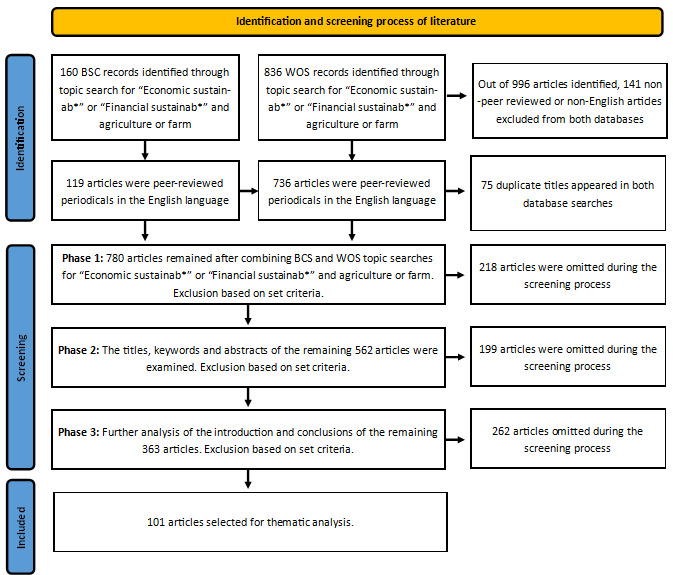 The research undertaken in this study identified peer-reviewed academic articles on the economic sustainability of farm enterprises using two academic research databases, Web of Science (WoS) and Business Source Complete, on 3 January 2025 to pinpoint all articles published up to 31 December 2024. The justification for using WoS over others is that it has become a synonym of quality for all social science journals (Wang et al., 2014), while Business Source Complete was chosen based on its comprehensive coverage of peer-reviewed academic journals. Conscious decisions were made in the search criteria options, including not limiting the timeframe for when studies were undertaken on this topic. No limitations were placed on the search based on the type of journal or journal rankings, except that only peer-reviewed articles were included. As the topic of sustainability in agriculture is interdisciplinary, these choices were made to gain a comprehensive understanding of research undertaken on this topic across various disciplines.