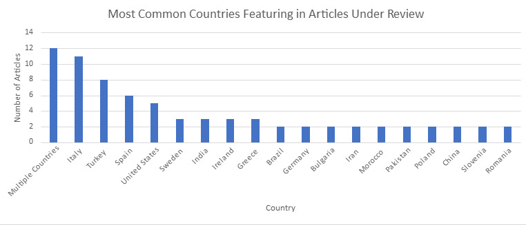 The analysis highlights that the most featured country in the articles reviewed is Italy with 11 relevant studies. Some studies explored multiple countries with Figure 6 highlighting 12 articles falling into this category. Typically, these studies compared the same farm system in different settings, most exclusively looking at European countries. After Italy, Turkey, Spain and the United States were the most common countries featured in these studies. Many other countries, including Ireland, had only two or three studies focusing on the economic sustainability of farm enterprises. It is evident that farms from a wide geographical range of locations are being explored. It should be noted that geographical location is an important variable that can play a crucial role in the economic viability of farm enterprises. For example, the availability of subsidies and trade systems differs from country to country and therefore impacts the farm’s profitability and investment opportunities.
