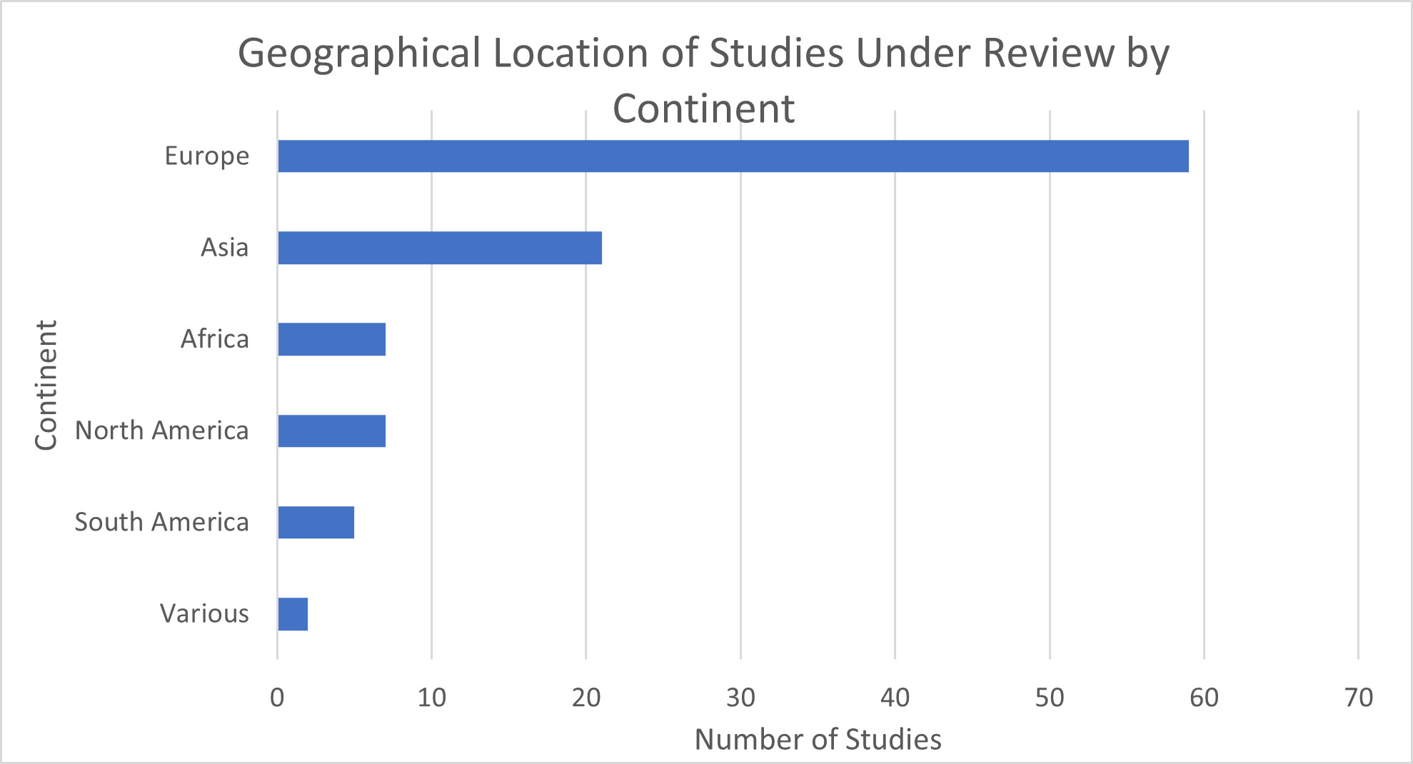 The geographical location of the farms featured in the 101 articles under review was examined both at continent (Figure 5) and country level (Figure 6). Firstly, Figure 5 depicts the locations on a continental basis and shows that more than 50% of the analysed studies were based in Europe. After Europe, the next most prominent location explored is Asia, encompassing approximately 20% of the studies. Africa and North America have seen a moderate level of attention in this respect, but South America has rarely been evaluated in this prior literature on the economic sustainability of farm enterprises. Perhaps most surprising is that no studies in Australia were uncovered based on the search criteria. Finally, a mere one article included comparisons across multiple continents.